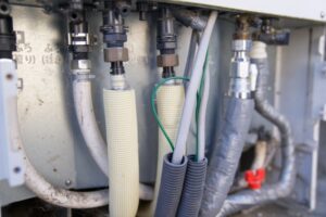 給湯器の外装を外すと、配管途中のつなぎ目のネジ部から水が漏れているのを確認。